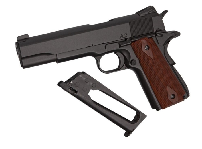 Dette slanke mørke gun-metal håndvåben har et ternet simulerede trægreb med en glat forrest rem for det klassiske 1911 look og følelse. Dan Wesson 1911 A2 har også 'ægte stål'-mærker samt den karakteristiske 'match'-gravering på det kromede ydre løb.