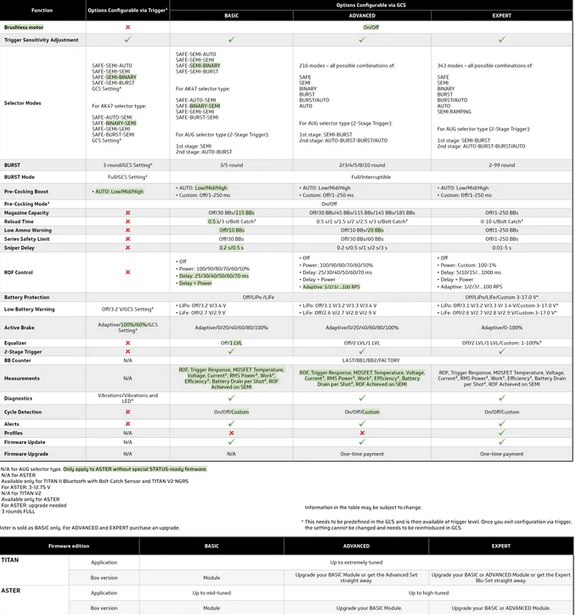- Mulighed for indstilling af pre-cocking, selector modes, magasin kapacitet, batteri beskyttelse, smart aftrækker, ROF control og meget andet