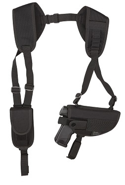 Skulderhulster med magtaske. Polstret mesh skulderpaneler giver kroppen mulighed for at trække vejret for maksimal komfort. Størrelsen er fuldt justerbar, så du kan bære hylsteret skjult eller åbenlyst. Dette hylster kan hurtigt ændres til enten venstre eller højre hånd spillere. Afsikringsrem med trykknap gør det nemt for et hurtigt træk. Et ekstra sikkerhedsstrop holder pistolen sikkert i holsteret under de strengeste aktiviteter.